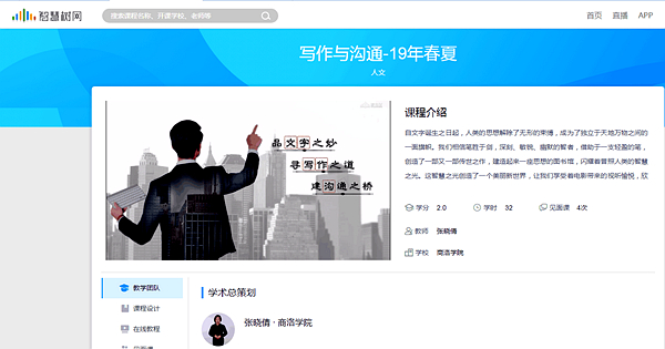 近日,英国365上市公司张晓倩副教授主持的《写作与沟通》课程在“智慧树网”成功上线运行。这是英国365上市公司教师主持建设的在线开放课程第一次在国内知名公开课程联盟平台上线。