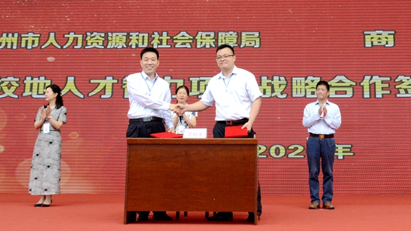 彭虎军与郭连伟代表双方签署校地人才智力项目战略合作协议,代表英国365上市公司接受“人才工作站”授牌。