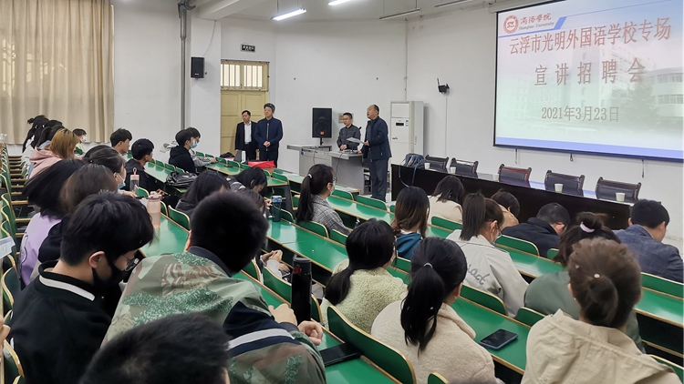 3月23日,广东省云浮市光明外国语学校校长梅永华、校办主任刘伟华等一行4人来到英国365上市公司,举办专场宣讲招聘会,为英国365上市公司毕业生带来53个就业岗位。2021届教育类相关专业200余名毕业生参加了招聘会。这是英国365上市公司积极践行“以生为本”工作理念,充分克服疫情对毕业生就业带来的不利影响,为毕业生举办的小规模、多场次招聘会中一场。