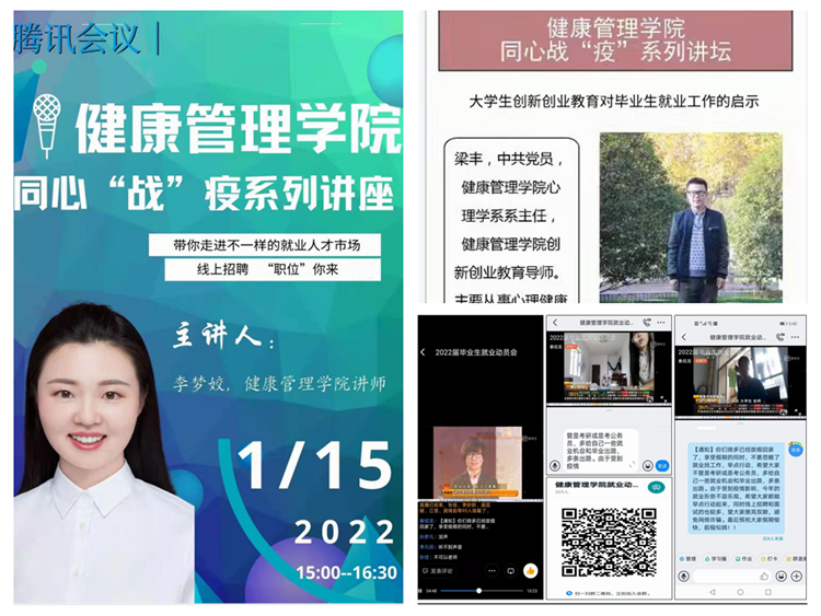 健康管理学院通过邀请学院创新创业教育指导教师举办“同心’战’疫”系列报告会;学院毕业班辅导员、班主任召开“2022届毕业生就业促进会”,为学生推送大量的就业招聘信息,进一步增强了学院毕业生积极就业紧迫感,大大转变了学院毕业生“先就业后择业”的就业观念。