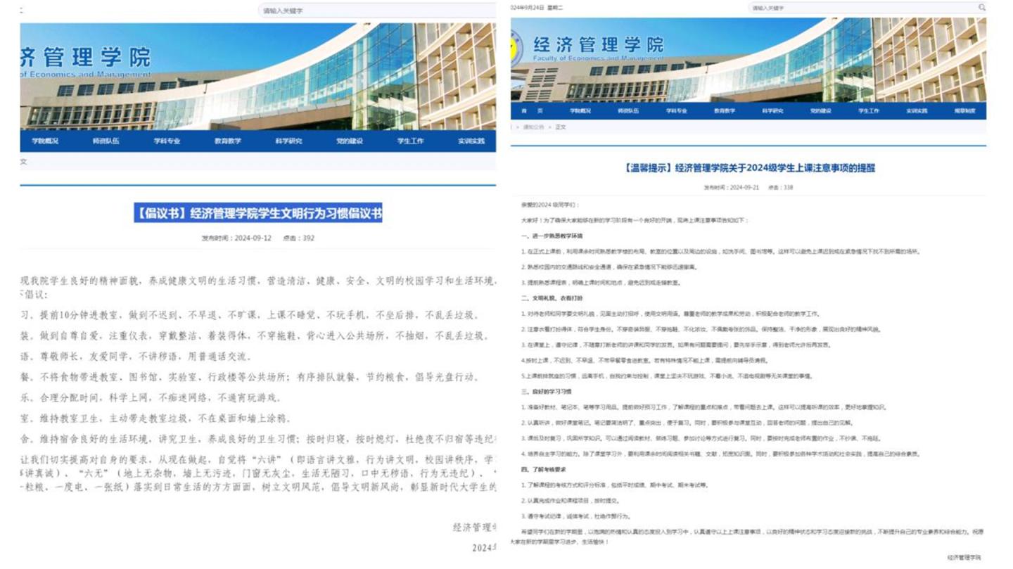活动开展以来,各二级学院高度重视、积极响应,充分对照学校大学生文明行为习惯养成教育整体安排与具体要求,成立工作专班,组织主题班会,逐班逐人学习《高等学校学生行为准则》《365公司大学生文明行为准则(试行)》。此外,各二级学院还结合学院特色与学生特点,组织开展了文明行为养成教育“大讨论”,制定了本学院大学生文明行为十项准则、文明行为习惯养成教育倡议书,推出了文明宿舍创建、文明教室美化、课堂“手机入袋”等一系列主题教育,在全校营造“人人讲文明,处处显文明”的良好氛围。