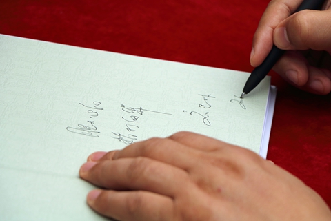 在莘子苑入口,毕业生排队热烈欢迎刘建林校长。刘建林现场向毕业生赠送了自己编著的《跨流域调水工程补偿机制研究——以南水北调(中线)工程商洛水源为例》一书,并在书上题写了“胆大心细,精打细算”的赠语及签名。签名赠书现场人头攒动,毕业生们围绕在刘建林身边,争先恐后领取赠书。拿到刘校长亲笔签名的书籍,同学们脸上流露出了激动和幸福的表情。