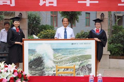 签名赠书仪式结束后,建工学院毕业生为了表达对母校的感谢之情,向母校赠送了学生徐焕章所作的国画《海纳百川》作为纪念。