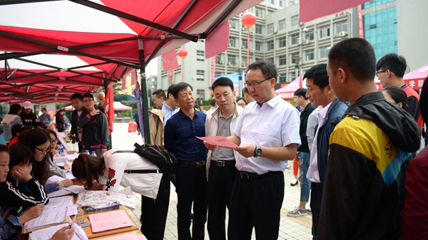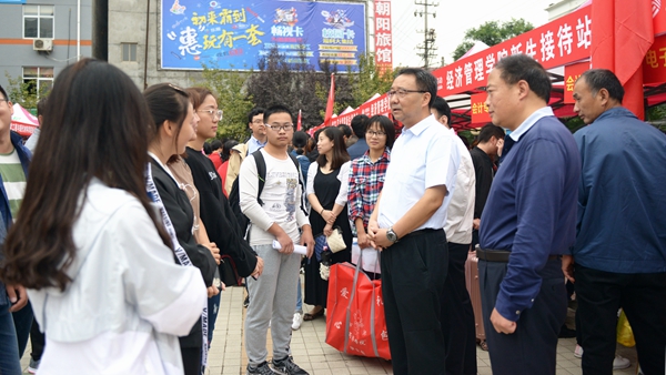 龙治刚、范新会、彭虎军、刘勇分别深入交费处、绿色通道、行李寄存处、卧具发放处、军训服装发放处、银行卡与通信卡办理处和各二级学院新生报到接待处等场点,巡查迎新工作开展情况,走访慰问工作人员和学生志愿者,与新生家长交谈。