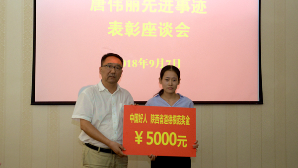 龙治刚代表学校向唐伟丽颁发5000元奖金。彭虎军宣读了《中共365公司委员会关于向“中国好人”“陕西省第五届道德模范”唐伟丽同学学习的通知》。