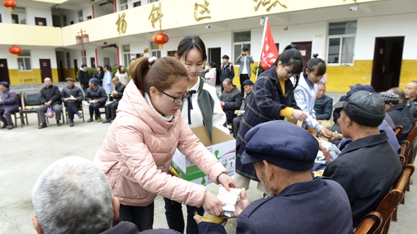杨斜敬老院坐落在杨斜镇的一个村庄里,青年志愿服务队冒雨来到敬老院。一进院子,这些常年生活在这里的孤寡老人们像见到亲人般喜出望外,因为经常来往,大家很快就和老人们互动起来。同学们在院子里唱歌、跳舞、说相声,为老人表演节目,给这个宁静的院子带来了欢声笑语,吸引了周边村民前来观看。管发亮老人激动地告诉我们,自己今年64岁了,无儿无女,曾经在街头靠乞讨生活,在政府的救助下,1992年来到敬老院,过上了有衣穿有饭吃的幸福生活。说到高兴处,管发亮吼起了秦腔,一连唱起《社会主义好》《回娘家》等歌曲。