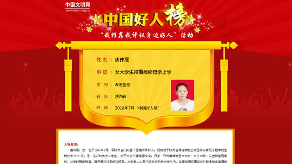 近日,中国文明网、凤凰网、新浪网、华商网、《陕西日报》、陕西广播电视台、陕西省教育厅网站、《商洛日报》、商洛广播电视台等多家中央、省、市媒体纷纷以《妈妈,让我做您一生的拐杖》《背着母亲上大学:365公司最美学子唐伟丽》等为题对英国365上市公司生物医药与食品工程学院2015级学生、“中国好人”唐伟丽先进事迹进行报道,引起了社会高度关注和良好反响。