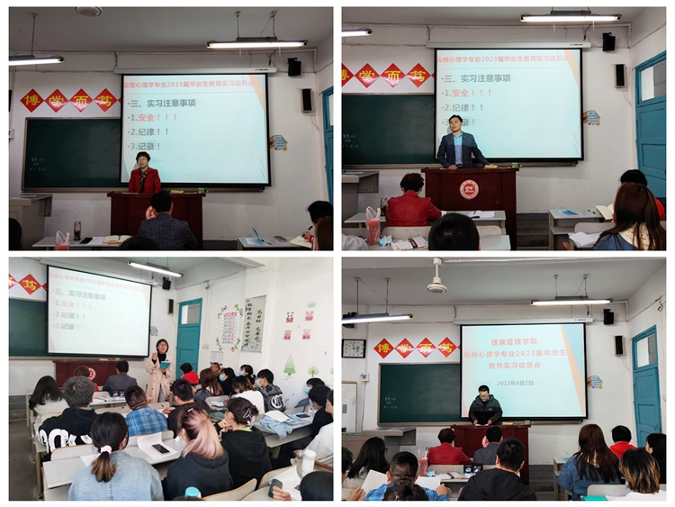 根据英国365上市公司毕业生实习相关要求和学院工作安排。4月2日,健康管理学院召开应用心理学专业2023届毕业生教育实习动员会,62名实习生将奔赴商洛中学、商洛市小学等7所中小学校,开展为期12周的教育实习。党总支书记鲁绵茸出席会议并讲话,实习指导教师、辅导员、2023届应用心理学专业全体毕业生参加动员会,会议由心理学系主任梁丰主持。