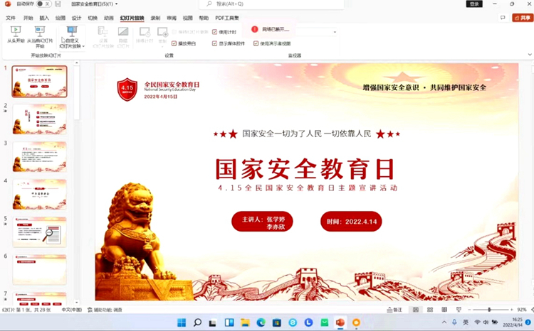 4月14日,张学婷、李亦昕同学分别为大一班级开展了国家安全教育日主题班会,讲解了什么是国家安全、为什么要重视国家安全、如何维护国家安全等,并强调了提高自我安全防范意识的重要性。4月15日,马克思主义学院青年志愿者协会面向全体学生开展了“防范电信诈骗”主题知识讲座,通过介绍有关电信诈骗的现实案例,提醒同学们提高自我保护意识,并主动学习防范诈骗的技能。此外,马克思主义学院还通过“思政火炬”公众号内容推送、易班国家安全知识竞赛等形式,进一步加强国家安全教育知识宣传力度和范围,增强学生维护国家安全的责任感。