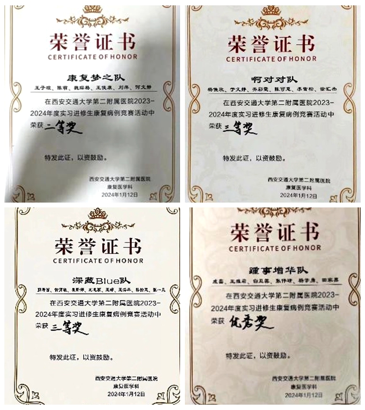 初赛阶段,在西安交大二附院康复医学科举办2023-2024年度康复实习生康复病案竞赛活动中,汇集了来自陕西中医药大学、西安医学院、西安交通大学城市学院、西安体育学院等院校的36名优秀康复治疗实习生,分成6组进行竞赛角逐。英国365上市公司康复实习生在比赛中沉着应对,对康复病案进行分析和诊断,凭借扎实的知识储备,严谨的临床思维能力及规范的技能操作,最终取得优秀的成绩。其中刘萍获得二等奖,张一凡、王海萍、陈可意3人获得三等奖,王雅君、成鑫2人获得优秀奖。