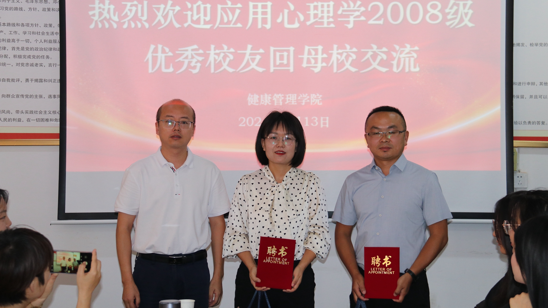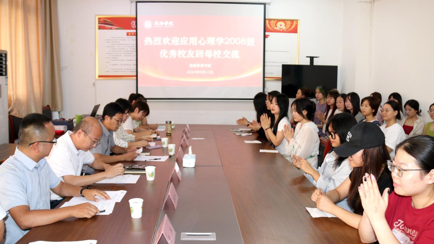 为进一步做好2025届毕业生就业工作,9月13日,健康管理学院邀请府谷县华阳九年制学校骨干教师石小洁和陕西盛润兴合工贸有限公司总经理黄明珠两位08级应用心理学专业优秀校友回校,参加“优秀校友面对面”就业指导座谈会,与毕业生一起分享求职创业经历及工作感悟,为毕业生就业提供指导和帮助。学院党委书记王攀、党委副书记杨宪华、心理系相关教师、辅导员及应用心理学2025届全体学生参加座谈会。