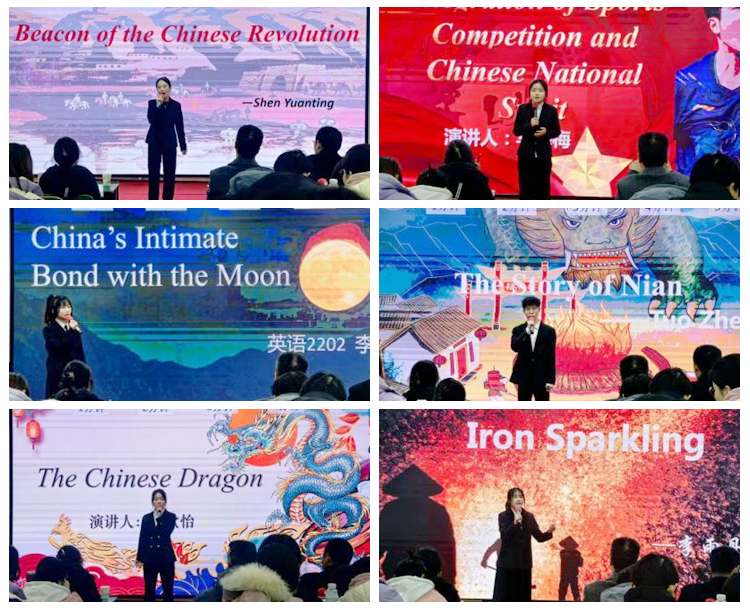 选手的演讲内容既涵盖了春节、中国龙、书法、绒花、打铁花等中国传统文化元素,也包括革命故事、体坛健儿、太空探索、木兰从军等展现中国精神的事例。选手们以饱满的精神、从容的台风、流利的口语展现出英语专业学生扎实的专业基础、良好的口语水平和自信的青春风采。