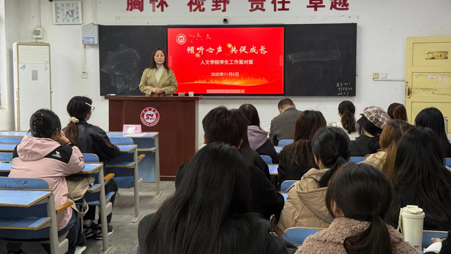 为深入了解学生学习与生活需求,构建畅通高效的沟通桥梁,11月6日,人文学院举办“聆听心声,共促成长——学生工作面对面”座谈会。人文学院党委书记刘麦霞、党委副书记王刚、副院长张建军、教学秘书、学工办主任及人文学院各年级学生代表共同参与了本次活动。